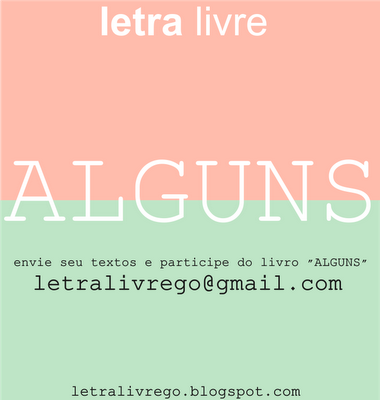 O letra livre em parceria com o projeto Goiânia em Prosa e Verso está reunindo textos para o lançamento do livro de coletâneas chamado "ALGUNS". Reunindo o trabalho de escritores que frequentam o Sarau letra livre e pessoas de qualquer parte do país. Participe, envie seu trabalho, seja ele, poema, poesia, verso, frase ou conto, o gênero textual não importa, o importante é participar. envie um e-mail contendo no máximo três textos, para letralivrego@gmail.com ATENÇÃO. O prazo para envio dos textos vai até o dia 10 de Abril.